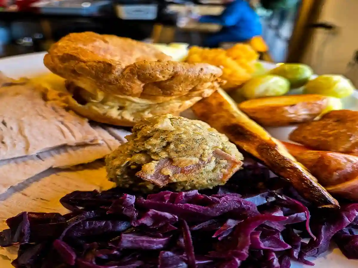 "I’m always skeptical of veggie roasts, but the nut roast was hearty and well-seasoned. The real stars were the honey-glazed parsnips and the proper vegetarian gravy."